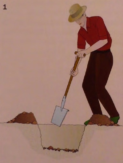 Посадочная яма должна иметь диаметр, превосходящий диаметр прикорневого кома по крайней мере в полтора раза, а при тяжелой почве диаметр ямы следует сделать еще большим. Вода в яме ни в коем случае не должна застаиваться (необходим ее сток). Если дно посадочной ямы рыхлое, достаточно, чтобы ее глубина лишь незначительно превышала высоту прикорневого кома. При наличии слишком уплотненной почвы (что характерно для новых приусадебных участков) обязательно следует попытаться взрыхлить землю, даже если для этого придется выкопать очень глубокую посадочную яму. В этом случае извлекаемую из ямы почву затем забрасывают в нее вновь. В верхний слой (на высоту корней растения) для облагораживания почвы добавляют вызревший перегной в пропорции одна часть перегноя на три части земли.